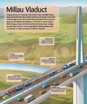 Jembatan inimelayani lalu lintas di bagian selatan Perancis, Jembatan Millau viaduct melintas di atas Sungai Tam seperti jaring laba-laba berputar dalam awan. Sebagai jembatan lalu lintas kendaraan tertinggi di dunia, plat dek jembatan melayang 270 m di atas ngarai, dengan tiang peregangan tertinggi 343 m. Insinyur Perancis Michel Virlogeux bekerja dengan arsitek Inggris Sir Norman Foster untuk merancang struktur cable stayed. Ini diresmikan oleh Presiden Jacques Chirac pada 14 Desember 2006, dan dibuka untuk lalu lintas dua hari kemudian.